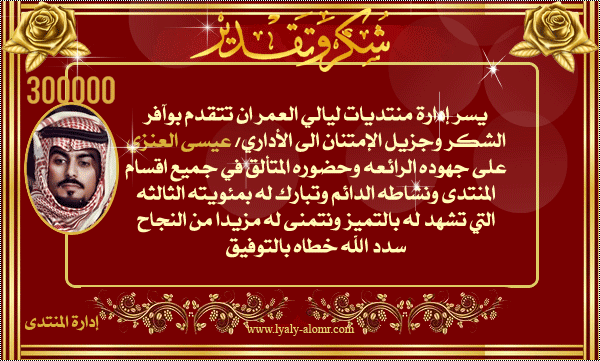 [ALIGN=CENTER][TABLETEXT="width:999px;background-image:url('https://www.khlgy.com/do.php?img=103304');"][CELL="filter:;"][ALIGN=center] صباحكم سعاده و فرح اليوم يحتفل كل المنتدى بشخصيه مميزه بحضوره الرائع ونشاطه الأروع لحروفه رونق من بحور الجمال لعبق كلماته رائحة وهو ناصع النقاء بقلبه وباخلاقه الكريمة اسم كتب حروفه من المسك وتوشح بالأخلاق صفة والبساطه عنوانه هو من كسب مودة الجميع دون استثناء شخصية لها حضور جميل ورائع اسم عرف ببساطة الحضور وجمال الكلمة اهنئى المتميز والمتألق دوما عيسى العنزي ابـــداع نـــشـــود... وحـــضور مــــرمـــوق... حـــروفه كالذهب كلماااته كالدرر... اذا كتب تميز... واذا حضر ابدع ... وكان ابداعه اكبر دليل وها نحن نرى ثمرة جهوده تزداد بأبهى الحلل عندما يعانق مئويته الجديده الثالثه 300000 لكَ في كل رد .. نصيبٌ من التميّز.. تُجبر من حولكَ على الإحترام.. وحضور متألق في سماء المَنتدَى َ وللجمآل روآية لاتدرك بعد من فيض عزفك مئويه جميله ابدعت فيها بنهر متدفق من الإبــداع وعطآء لايزول. الف الف مبرووووك ويمنح شهادة شكر+وسام المئويه+2000مشاركه ومثلها تقييم https://www.khlgy.com/do.php?img=103302 وعقبال المزيد وانت تتمتع بثوب الصحه والعافيه تقبل تهنئة اختك المتواضعه [/ALIGN][/CELL][/TABLETEXT][/ALIGN] |