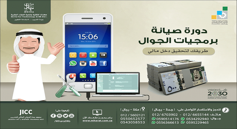صيَانة برمجيَّات الجوَّال احتراف صيانة الجوالات ... طريقك لتحقيق دخل مالي ... والمنافسة في سوق العمل باحترافية https://i.suar.me/AJG1e/m تطبيق عملي وشرح نظري لمدة أسبوع تدريبي (( تعقد الدورة في جدة وفي مكة المكرمة )) في مقر معهد جدة الدولي العالي للتدريب خصم خاص للتَّسجيل المبكِّر وللمجموعات والجهات الخيريَّة احصل على شهادة معتمدة من المؤسسة العامة للتدريب التقني والمهني برقم ( 252229924 ) للاستفسار نرجو التواصل عبر الهاتف أو الجوال أو الواتس أب: مدينة جــــدة 0126655144 -- 0126703902 0590514176 -- 0595229465 0500058741 -- 0556366613 مدينة مكة المكرمة 0125602121 0550652577 -- 0543058553 سارع بحجز مقعدك الآن وسجل عبر الرابط التالي: http://bit.ly/2hs8zEc للاطلاع على الدليل التدريبي لشركة مهارات أنقر على الرابط التالي: http://bit.ly/1xMUg0O سجلوا أيضا في دبلومات معاهدنا للرجال والسيدات https://i.suar.me/mXd0N/m |