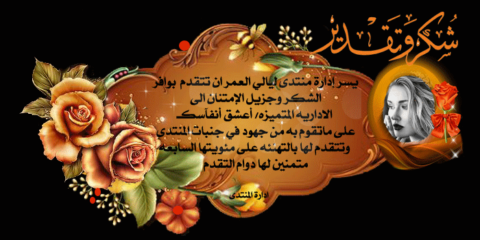 [ALIGN=CENTER][TABLETEXT="width:999px;background-image:url('https://www.khlgy.com/do.php?img=104138');"][CELL="filter:;"][ALIGN=center] تحيه معطرهـ".. بريح الـ ع ـــود والـ ع ــنبر و أجمل من المسگـ و الجوووري إخواني و أخواتي مازال الإبداع مستمر وهنا نرى شـ ع ــله النور" التي تلتمس بها طريق الإبداع" هنا نرى رائـعة التألق و التميز حضورها رائع و إبداعها مستمر و مواضيـ ع ــها جميله و مُتألقه اليوم معنا شخصيه جمعت بين الحضور و الإبداع ب أجمل العبارات و أروع الجمل رمز للعطاء ... بلا محدودية ... و لا مردود گ الشمس الساطعة ب قوة الحضور و جمال الگلمة و الوجود المعطر ب الحسن.. بها يتعطرالمكان بمؤيتها السابعه 700000 انها الرائعه أعشق انفاسكـ صاحبة الشخصيه الراقيه والمحبوبه وصاحبة الجهود والعطاء اللامحدود نقف مهنئين لها بمناسبة المئويه الجديده نقول لها من شغاف قلوبنا ألف ... ألف ... ألف ... مبروگـ صاحبة القلم المشرق الذي طالما اتحفنا بروائعه القلم الذي لايترگ مساحه إلا و رسم عليها أجمل الگلمات و أضاف لها أجمل الردود تأبى النفوس الشامخة إلا أن تصل إلى المعالي و تسمو إلى القمم فتتوالى مسيرة العطاء إلى أن يحين قطاف الثمر فيطيب المذاق و تتراگض الحروف مئويه عآمره ب گل قيم و مُفيد يتباهى بها منتدى ليالي العمر الــ مبروووووووووووگ ـف على ما وصلتي له مـن مُشارگات مفعمه ][ ب التألق و الإبـداع و التميز ] لتقدم لك باقة من مفردات التهنئة تفوح منها الأمنيات الصادقة".. بان يجعلها الله شاهدا لك لاعليك ومزيدا ان شاء الله من مئويات قادمه وانتي تتمتعين بثوب الصحه والعافيه الف الف مبرووووووك وتمنح شهادة شكر+وسام الالفيه+2000مشاركه ومثلها تقييم https://www.khlgy.com/do.php?img=104136 [/ALIGN][/CELL][/TABLETEXT][/ALIGN] |