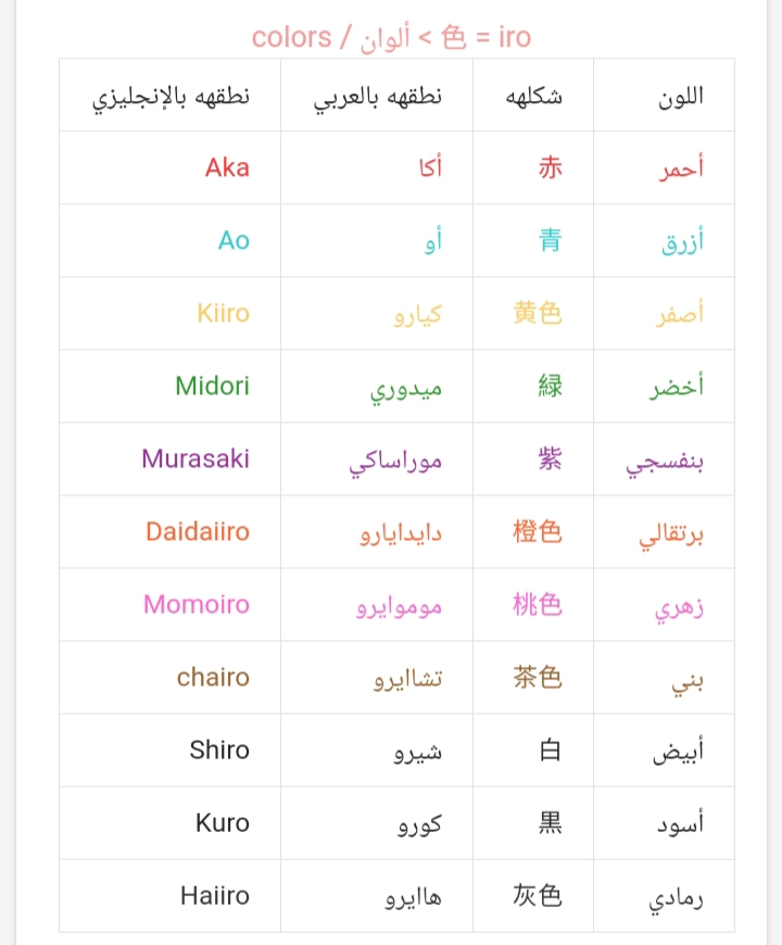 الالوان باللغة اليابانية
