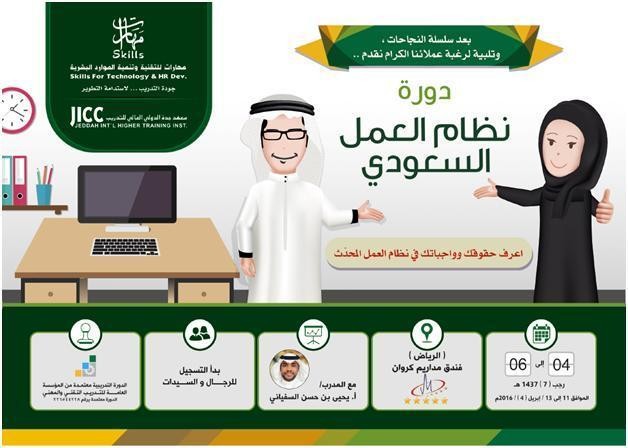 (( نظام العمل السعودي )) اعرف حقوقك وواجباتك في نظام العمل السعودي المُحدَّث مع المدرب/ يحيى بن حسن السفياني (( للرجـــال والسيـــدات )) مدة الدورة ثلاثة أيام ( فترة مسائية ) (( الريـاض )) بتاريخ 04 رجب 1437هـ الموافق 11إبريل 2016م تعقد الدورة في فندق مداريم كراون معتمدة من المؤسسة العامة للتدريب التقني والمهني برقم ( 226544228 ) للتسجيل أو الحجز أنقر على الرابط: http://bit.ly/1ZpzH3y للاستفسارنرجوالتواصلعبرالجوالأوالواتسأب: 0556399903 – 0500938303– 0508184499 فاكس: (الرياض) 0112017092 بريد إلكتروني: info@mharat.ws للاطلاع على الدليل التدريبي لشركة مهارات أنقر على الرابط: http://bit.ly/1xMUg0O https://i.suar.me/dXva/m |
