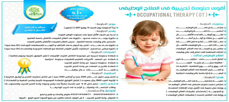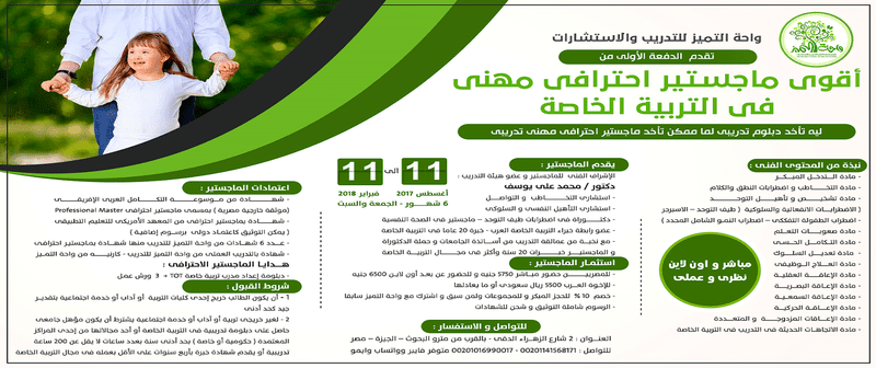 أقوى مــاجستير احـترافى تدريبى فى الــــتربية الخـاصة 11 - 8-2017 المــــاجستير الاحـــترافى التدريبى فى الــتربية الخـاصة الأقوى و الأضخم فى الوطن العربى ( نظرى و عملى ) – ( مباشر و أونلاين ) . على مدى 6 شهور مكثفـــة... واحــة التمــيز مصر .. كل جمعة و سبت .أسبوعيا .. أكثر من 13 مادة دراسية تدريبية فى مجال التربية الخاصة بقوة و بالعمق .. عدد 3 شهادات بمسمى ماجستير احترافى منها شهادة واحدة متوثقة خارجية مصرية .. فى أحد التخصصات التالية : التــوحــد - التخاطب و اضطرابات النطق – الإعــــاقة العقليــــة - صعــوبات التعلم... 50 يوم دراسة يمكنكم الاستفسار عن المنحة الشاملة لإعداد أخصائى التربية الخاصة ( دبلومة 300 ساعة 3 شهور ) - .. للماستر الاحترافى : تمتع بخصم 10 % للحجز المبكر، و لمن اشترك فى منح و دورات واحــــة التمــــيز سابقا ، وخصم خاص المجموعات 20 % للعدد 5 مشتركين فأكثر(حتى 25 يوليو يمكن الحجز بسداد نصف الرسوم و التقسيط على شهرين إلى 3 شهوربحد أقصى ) 🎁 🎁الاستثمـــار مدعم و مخفض فمن حيث الكم و الكيف الفائدة للدارس لا تقدر بثمن : ************************************************** ************** 🎁 للمصـــريــين فقط حضور مباشر 5750 ج و أونلاين 6500 ج 🎁 🎁للإخوة العـــــرب 5500 ر س أو 1460 دولار https://i.suar.me/yBrwo/m ✔ ✔ ✔ للتواصل و تأكيد الحجز وارسال صور الأوراق و الرسوم يمكنكم التواصل على الخاص على رابط البيدج التالى : mUTXD أو أرقام الموبايل و الواتس و ايمو ✔ ✔ ✔ العنـــــوان : 2 شارع الزهراء الدقى - بالقرب من مترو البحوث – الجيزة – مصر ✔ ✔ ✔ للتواصل : 00201141568171 - 00201016990017 متوفر فايبر وواتساب وايمو 🎀 🎀 🎻و 🎻 عمالقة التــربية الخـاصة من أساتذة الجـامعات و حملـة الدكتــــوراة و المــــاجستير و خبرات معظمها فوق 20 عاما من العملى يعنى بتأخذ خبرات و مهارات تشغلك 🔥 🔥 🔥 ده غيــر مفـــاجآت أخرى بيتم ( سيتم الإعلان عنها وقت التدريب مباشرة ومستويات متقدمة للمتفوقين فى الدراسة و التدريب ) . 📚 📚 📚 ماجستير احترافى هتعيش حياة البحث العلمى المقــــنن و المعتبر مع التدريب العملى و الخبرات العميقة ، و فيه تعمل أبحاث فى تخصص من التخصصات اللى هتتحددلك ، و أنشطة تطور تخصصك وحياتك ، منها بحــــث يتم نشــــــره فى إحدى المجلات الدولية فى مجال التربية (باسمـــــــك ) 🍬 🍬 🍬 تدريب عملـــــــى فى مستشفيات دولية و مـــــراكز كبـــــرى متخخصة على يد نخبة من أقوى المتخصصين فى التربية الخاصة . 📚 📚 📚 الإشــراف الفنــى للماجسـتير المهنى و عضو هيئة التدريب : ************************************************** ******** دكتــــــــور / محمـــــد علـــــــى يـــــــوســــــف استشارى التخاطب و التواصل – استشارى التأهيل النفسى و السلوكى – دكتــــــــوراة فى اضطرابات طيف التوحد – ماجستير فى الصحة النفسية - عضو رابطة خبراء التربية الخاصة العرب – عضو رابطة خبراء التربية الخاصة العرب –عضو الجمعية الأمريكية للتخاطب – عضو اللجنة العلمية لوضع معايير الجودة للعمل مع ذوى الاحتياجات الخاصة . خبرة 20 عاما فى مجال التربية الخاصة و التدريب الدولى فى كبرى الجامعات المصرية . و نخـــــبة من عمالقة التربية الخاصة من أساتذة الجامعات و حملة الدكتوراة و الماجستير بخبرات تتعدى 20 عاما المحتوى الفنى العلمى يضم أكثر من 13 مــــادة تــــدريبية متخصصة فى التربية الخاصة 📚 حقوق الملكية الفكرية المحفوظة حصريا لمؤسسة واحـــــة التمــــيز مصر ويمنع نسخ أو نقــــل أى أجزاء من الإيفنت أو محتواه بدون إذن كتابى مسبق منها ) : ) مــادة الــــــتدخل المبــــــكــــر من خلال ( البورتيدج و الهيلب ) 1 - 2 - مـــادة التخاطب و اضطرابات النطق والكلام 3 - مـــادة فى تشخيص و تأهيل التوحــــد ( الاضطرابات الانفعالية والسلوكية (طيف التوحد – الاسبرجر – اضطراب الطفولة التفككى– اضطراب النمو الشامل المحدد 4 - مــــادة صعوبــــات التعــــلم 5 - مــــادة التـــكامل الحــــسى 6 - مـــــادة تعديل السلوك 7 - مـــــادة العـــلا
